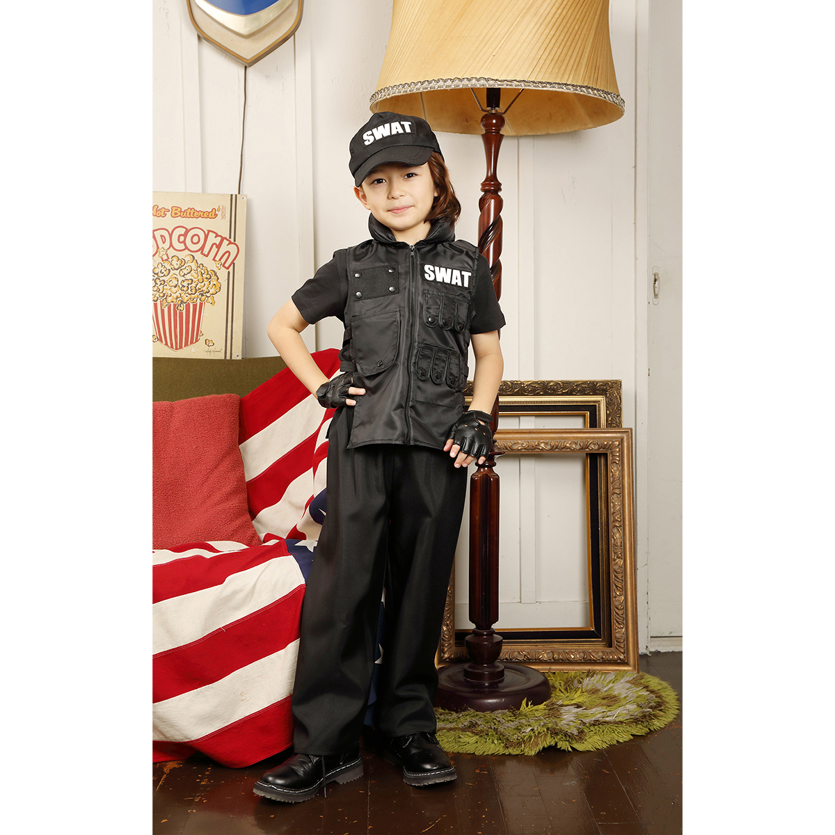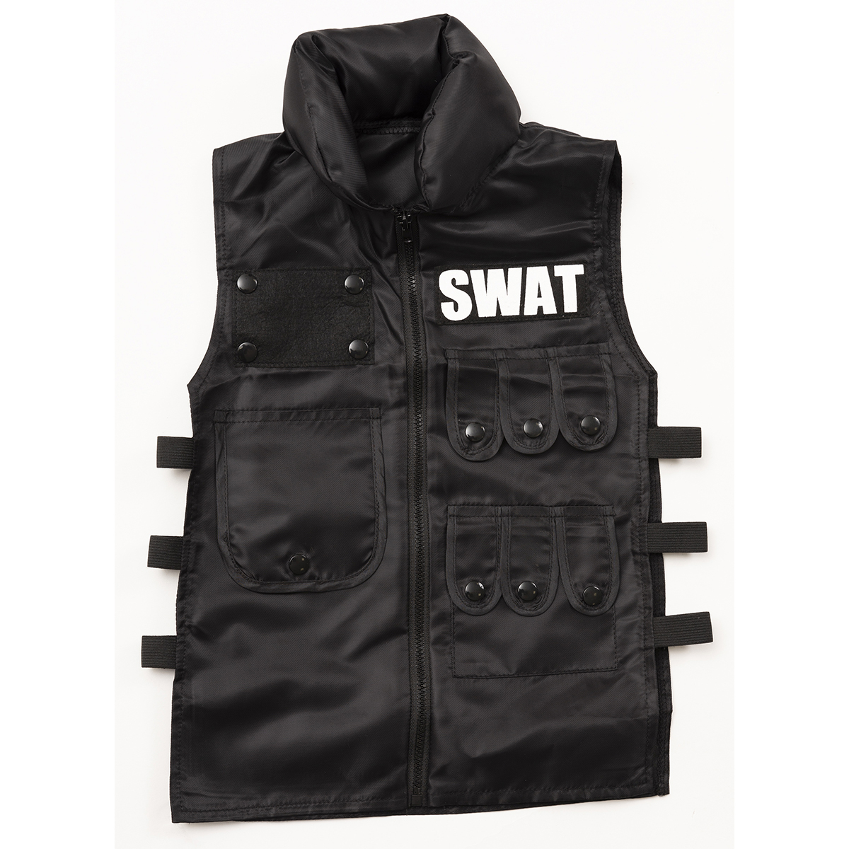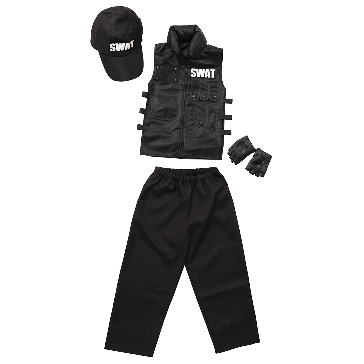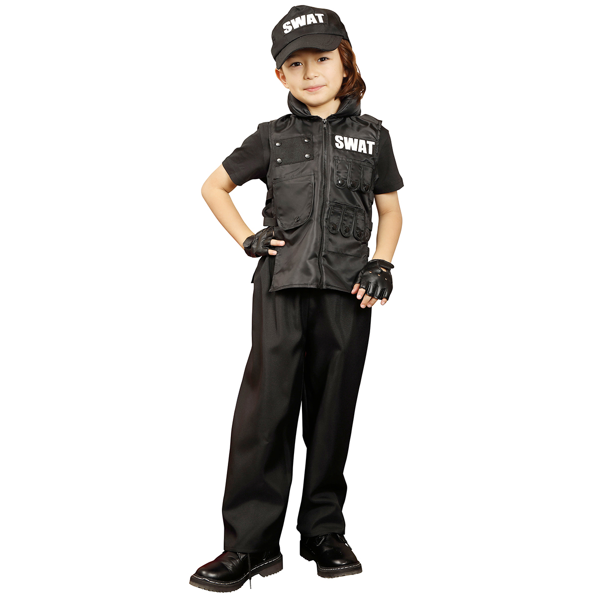 A cool 4-pieces set black based SWAT costume. The vest can be easily put on the top of everyday outfit, and the pants is easy to wear thanks to rubber on the waist part.
