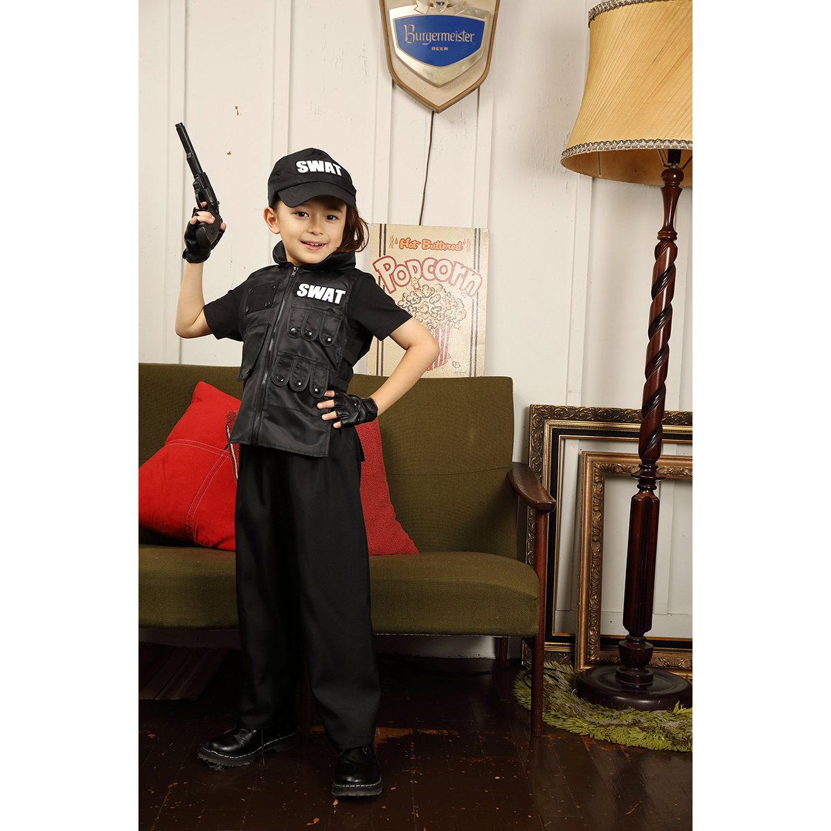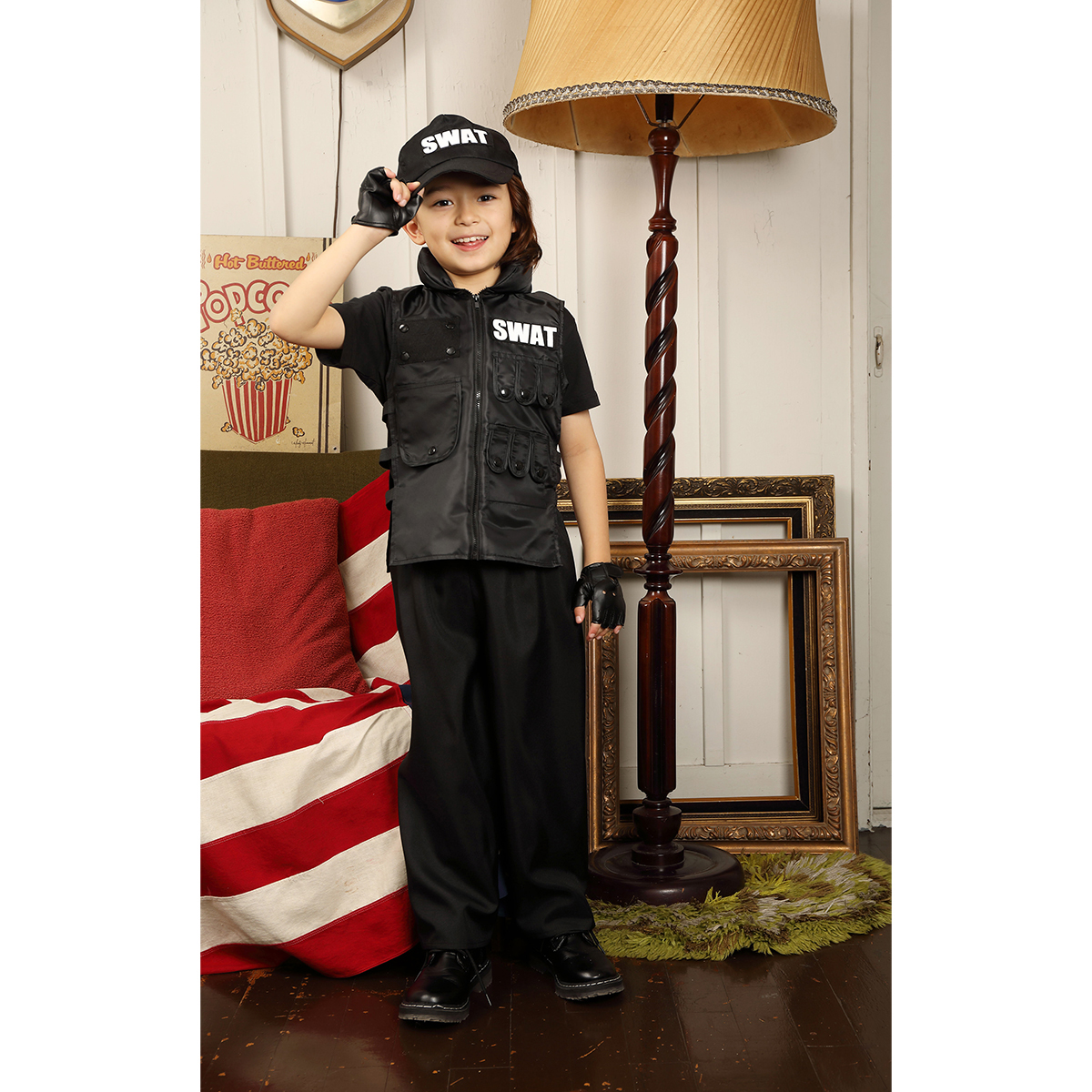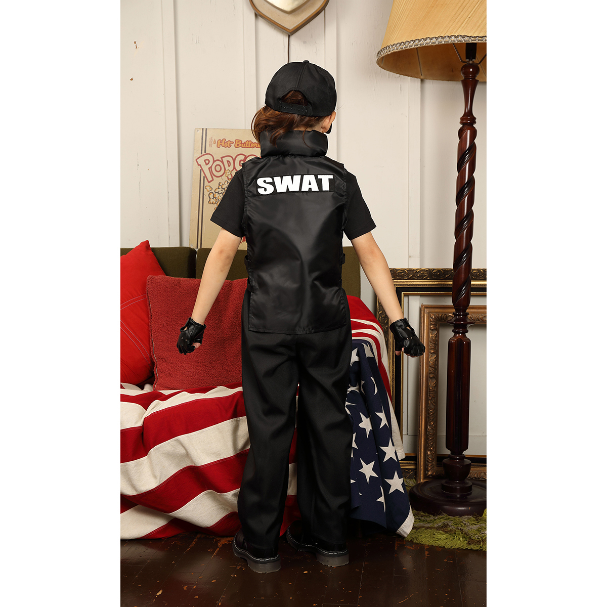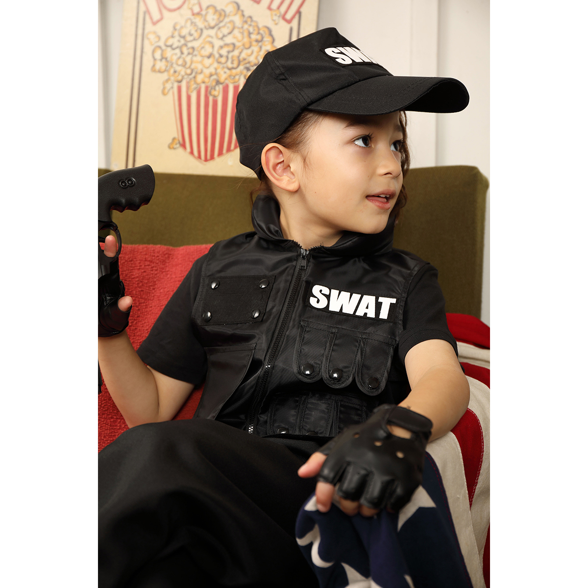 A cool 4-pieces set black based SWAT costume. The vest can be easily put on the top of everyday outfit, and the pants is easy to wear thanks to rubber on the waist part.