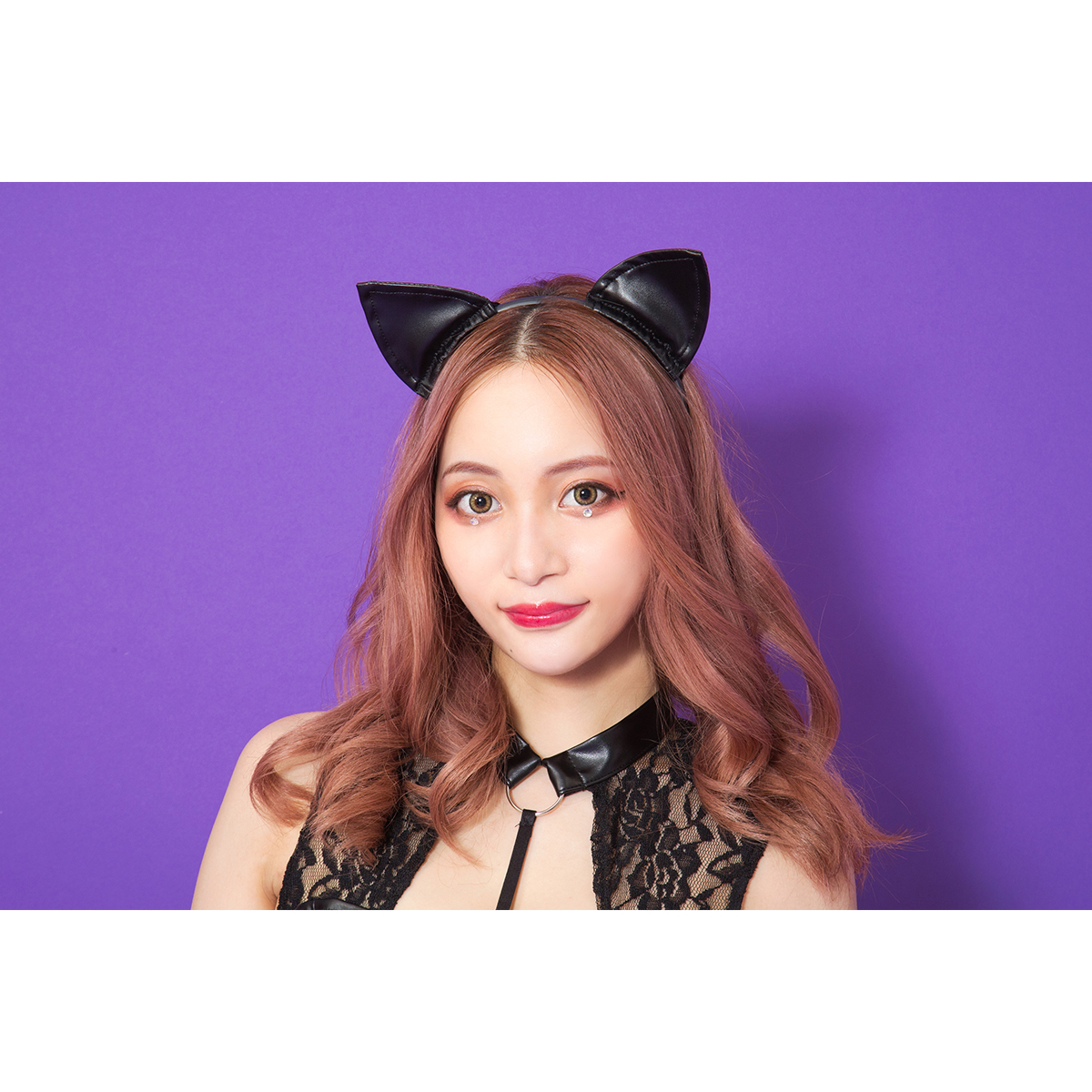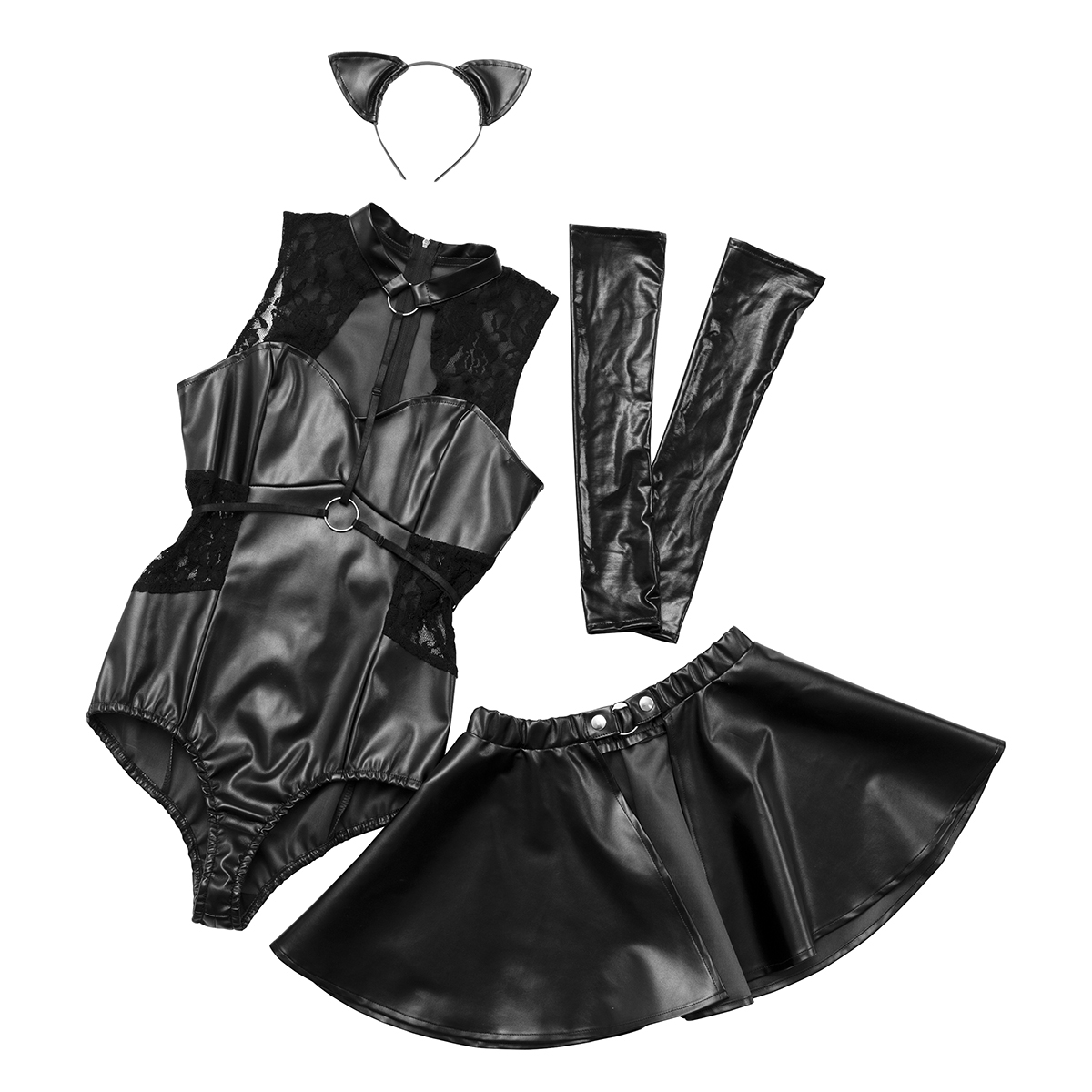 Fetishistic cat woman costume with fake leather and lace material. The harness that connects the costume from the neck is equipped with an adjuster and can be adjusted in size to fit the body. The décolletage and the side of the waist are made of lace material for a lady-like impression. You can wear it in 2WAY with just the body suit or without the skirt. The skirt can be attached and detached from the side of the central ring with a snap button.