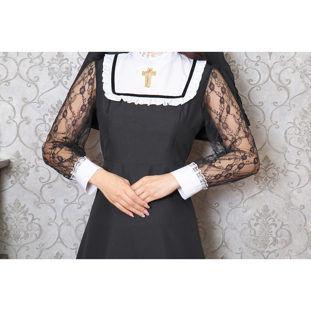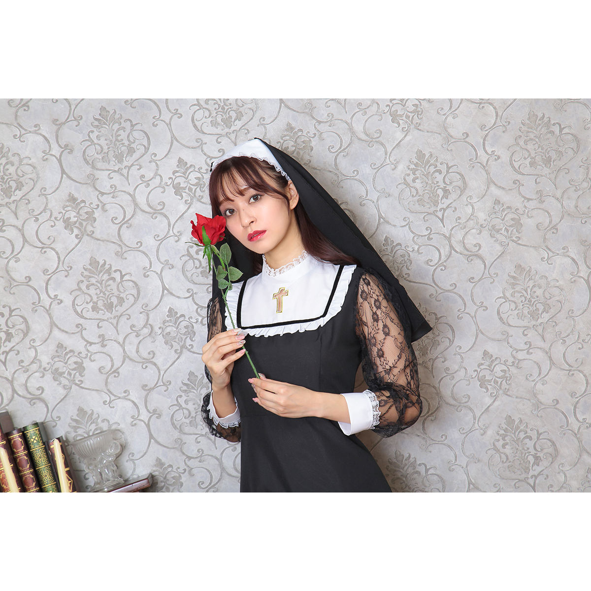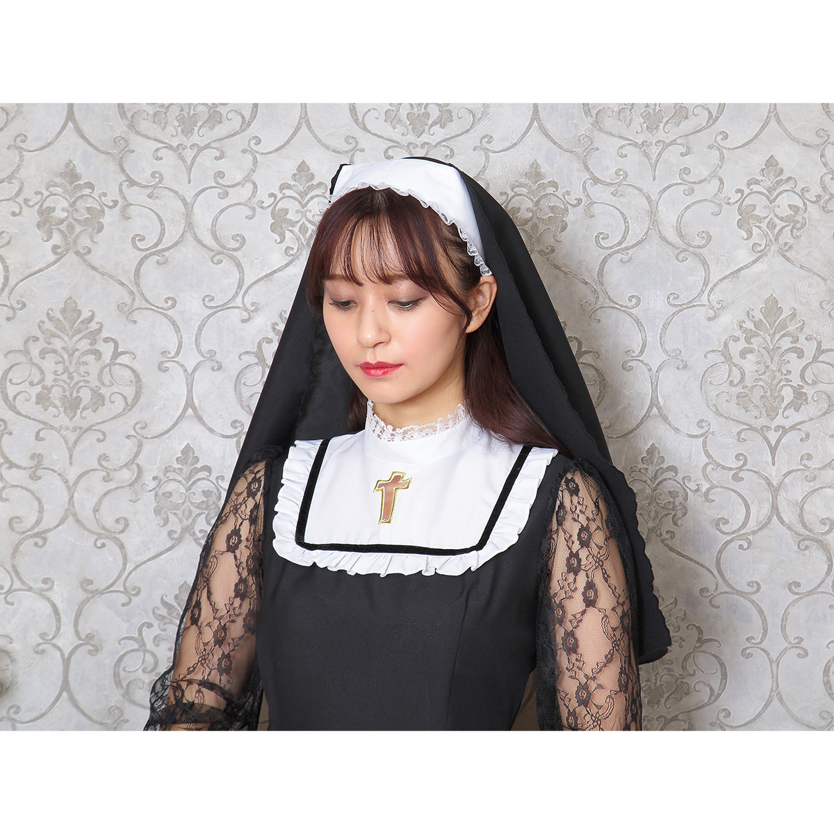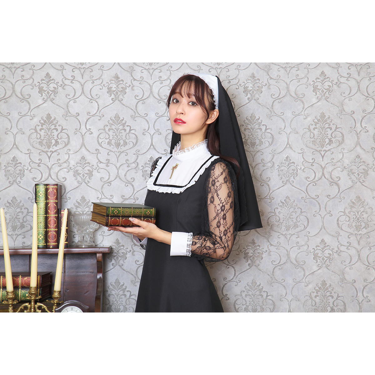 A long nun costume with long sleeves that covers whole body. The hollow cross around the neck is part of costume’s charm. Its sleeves are made from lace fabrics that give the costume feminine impression. Additionally, the edge of the veil is also laced.