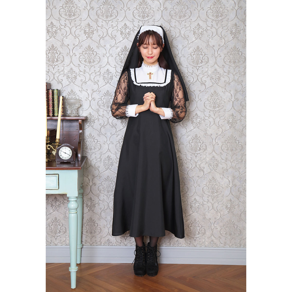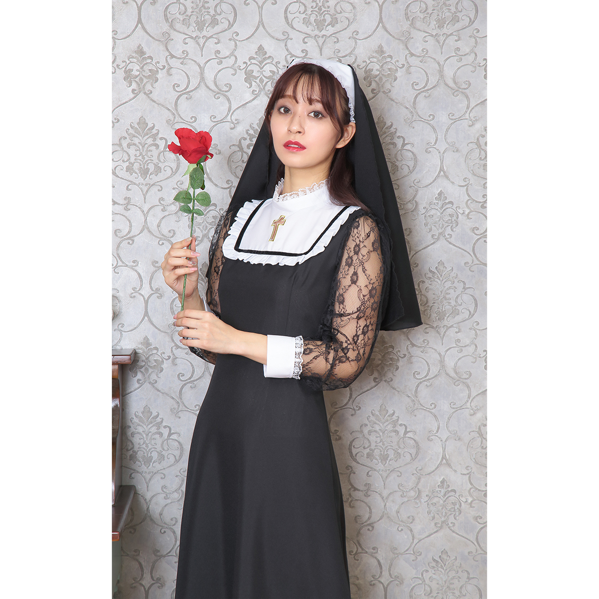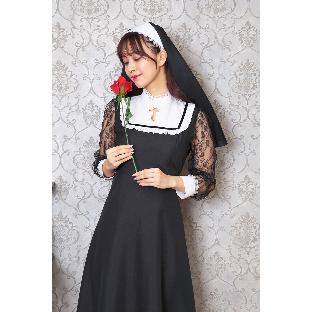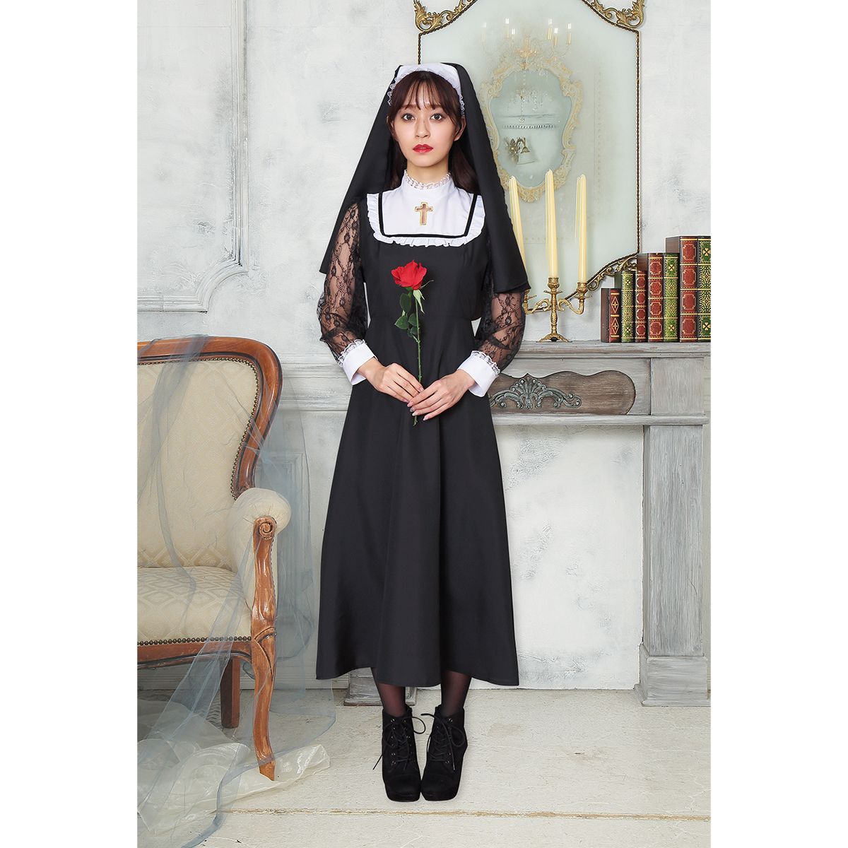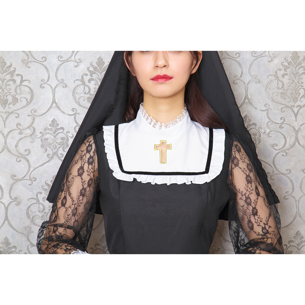 A long nun costume with long sleeves that covers whole body. The hollow cross around the neck is part of costume’s charm. Its sleeves are made from lace fabrics that give the costume feminine impression. Additionally, the edge of the veil is also laced.