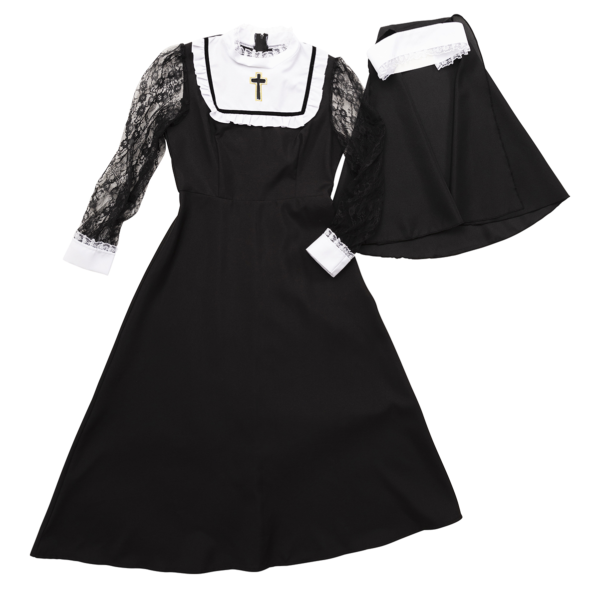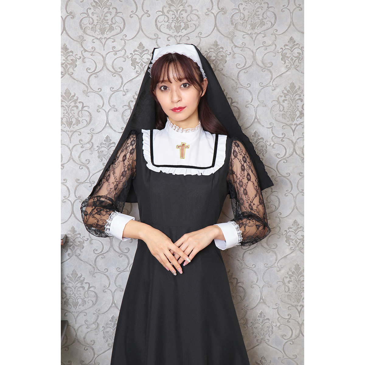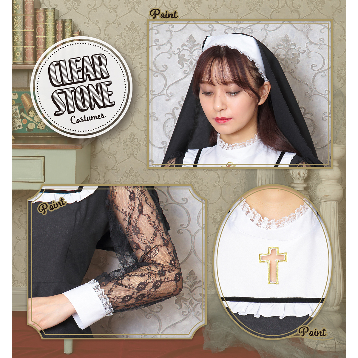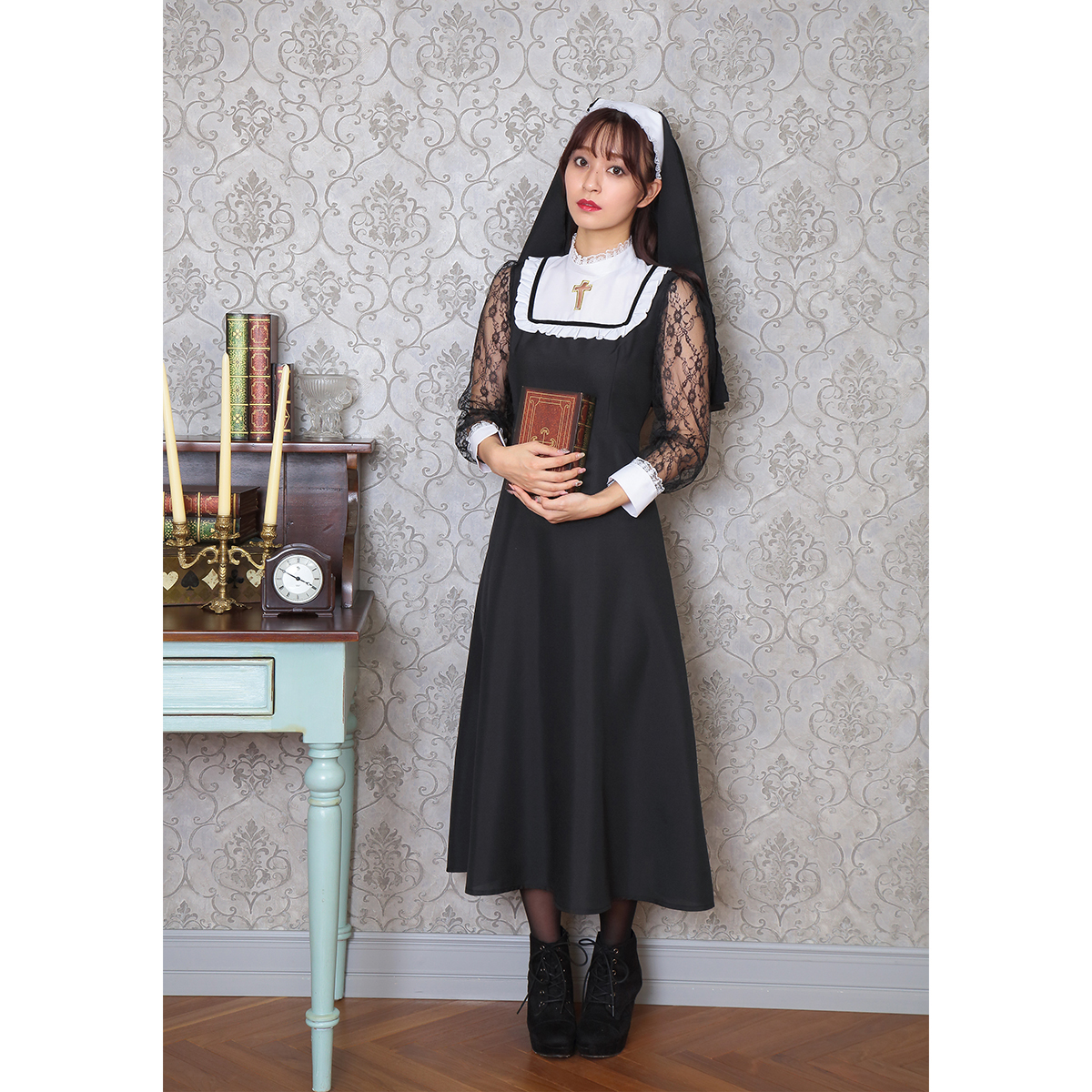 A long nun costume with long sleeves that covers whole body. The hollow cross around the neck is part of costume’s charm. Its sleeves are made from lace fabrics that give the costume feminine impression. Additionally, the edge of the veil is also laced.