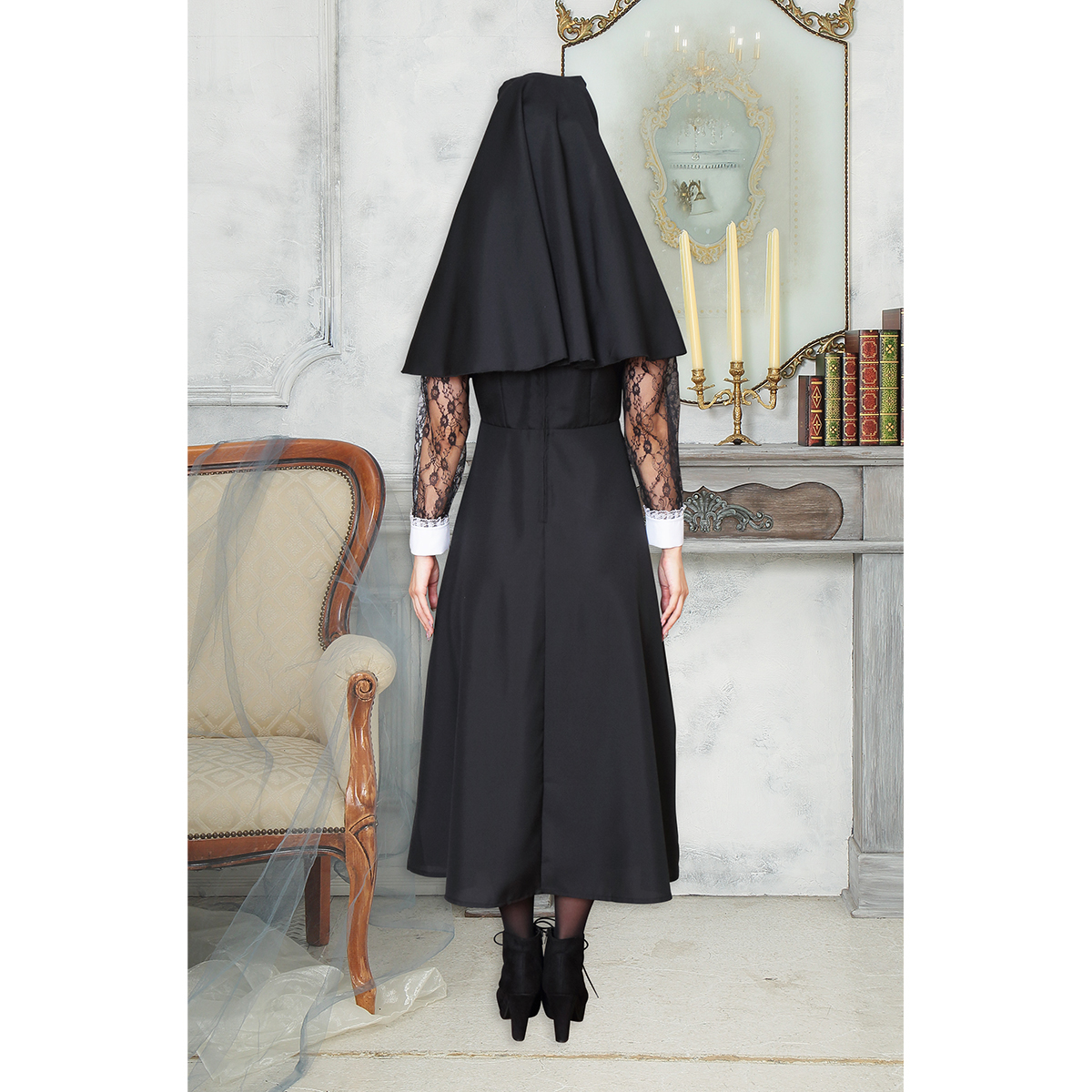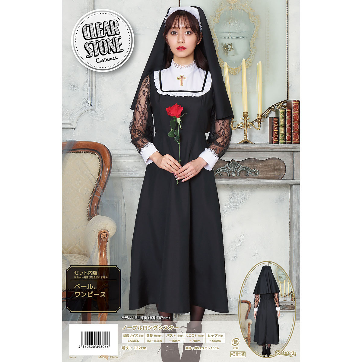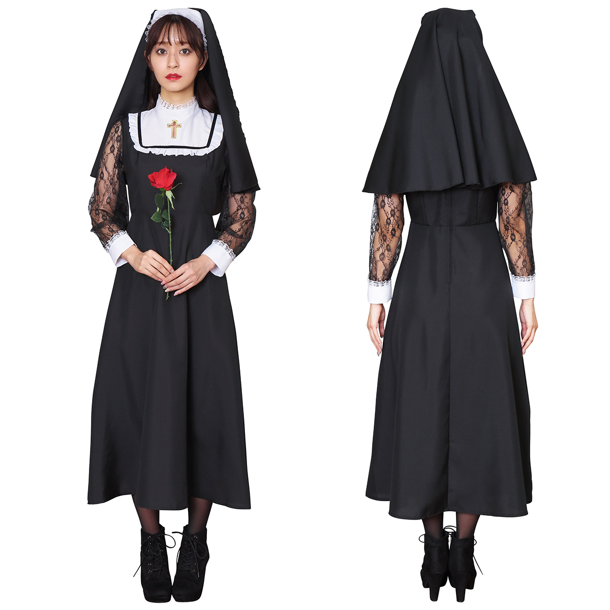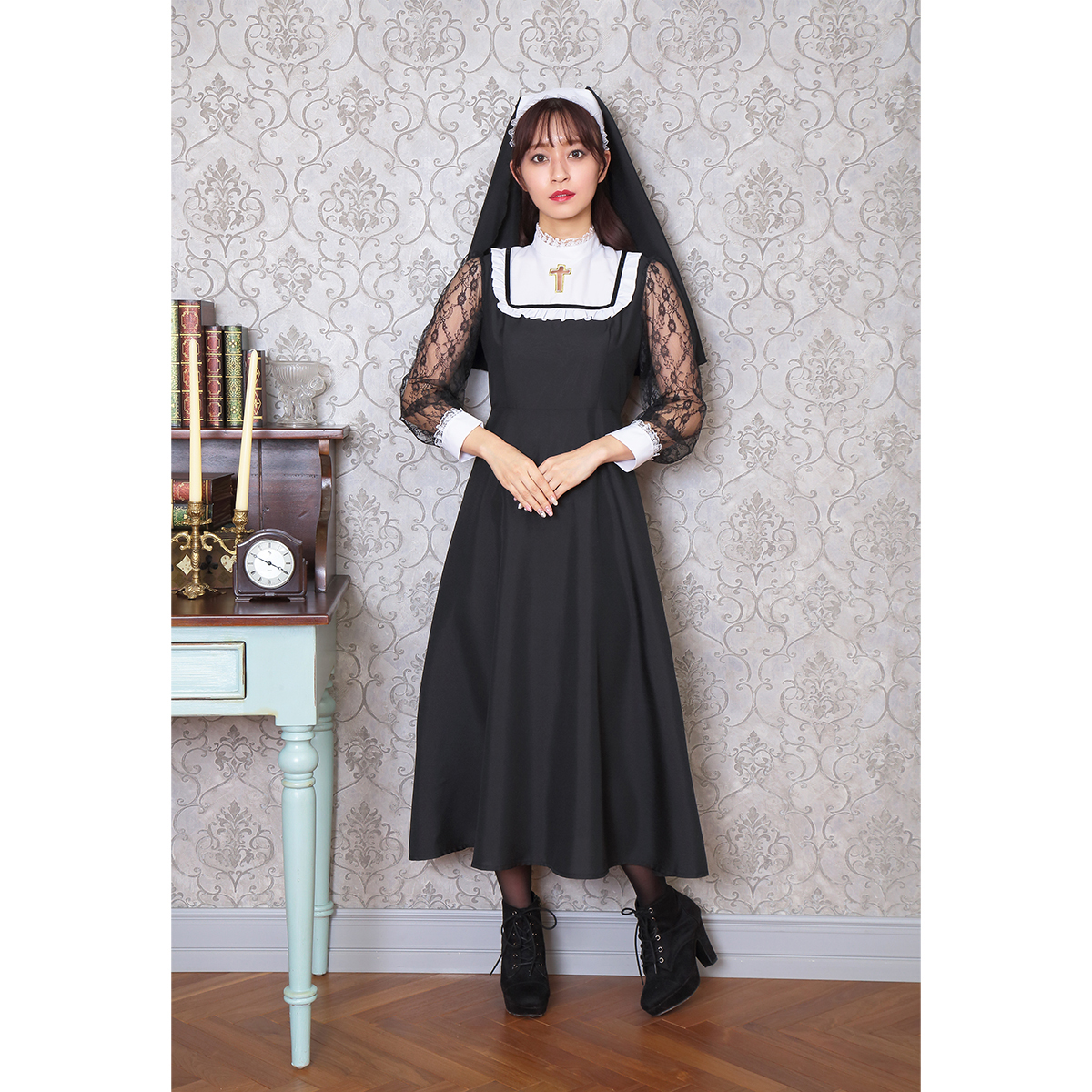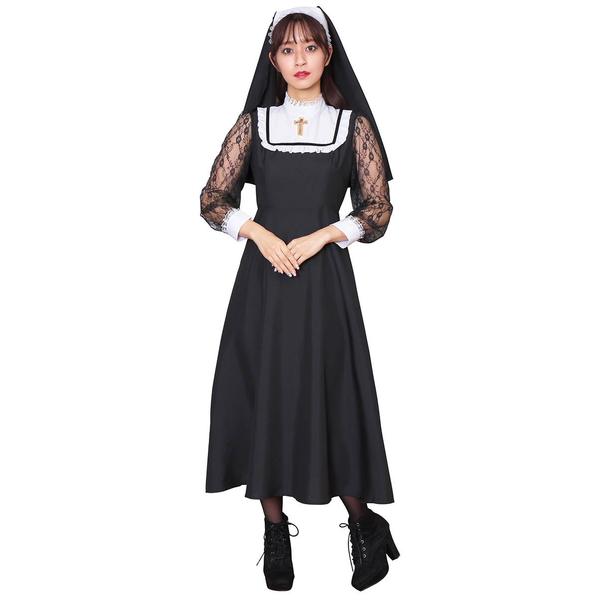 A long nun costume with long sleeves that covers whole body. The hollow cross around the neck is part of costume’s charm. Its sleeves are made from lace fabrics that give the costume feminine impression. Additionally, the edge of the veil is also laced.