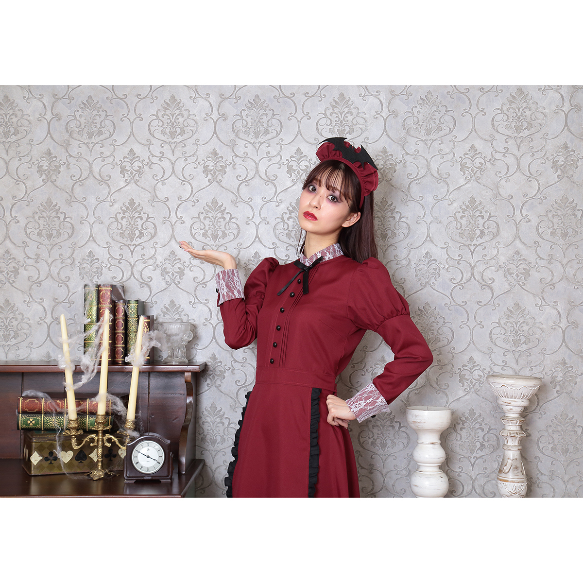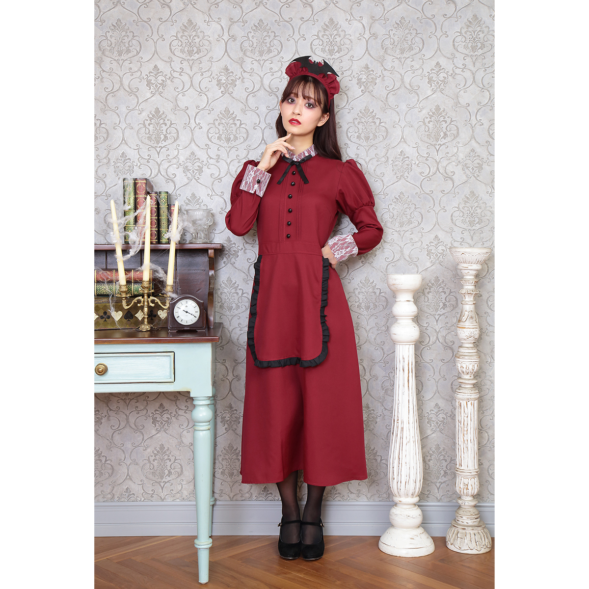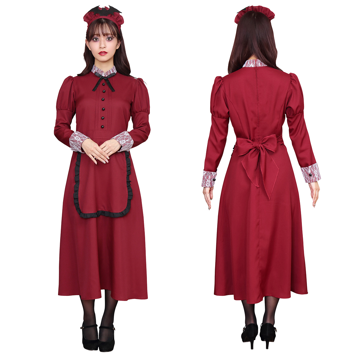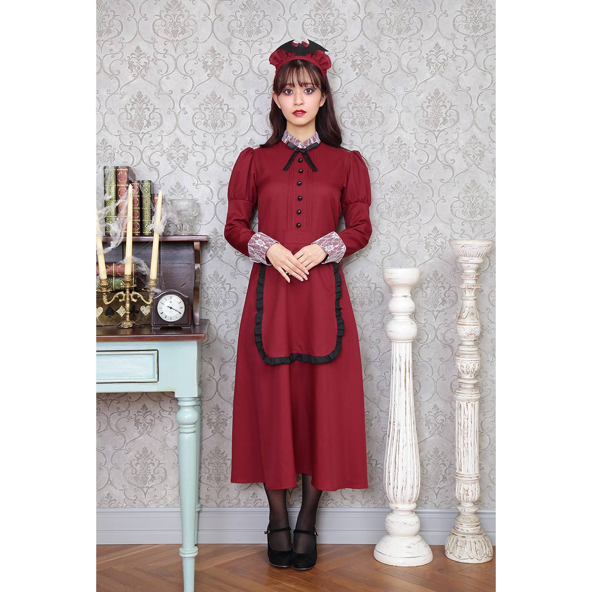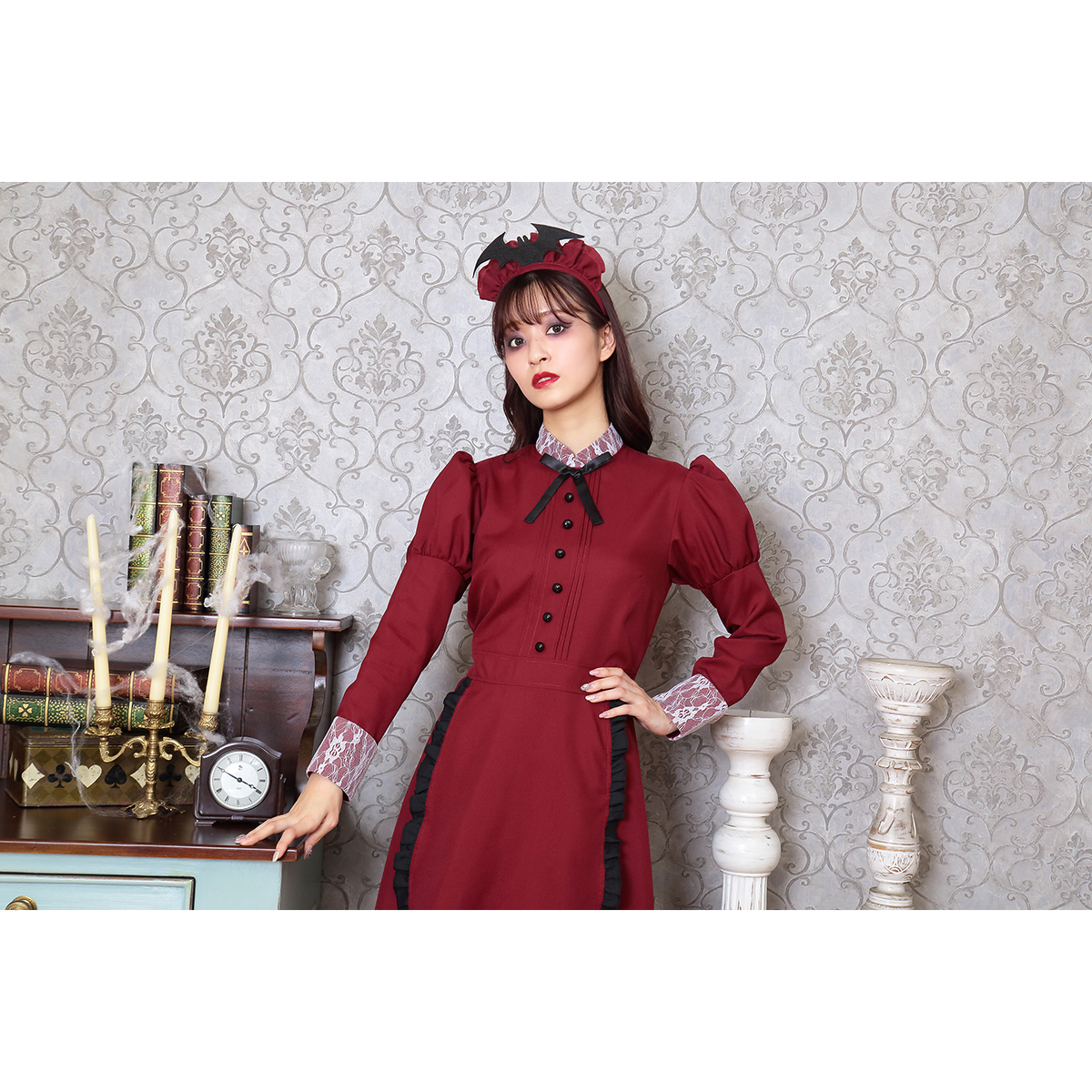 A famous western-style maid costume with deep red color. Bat attached on the headgear is part of costume’s charm. The long sleeves and long length also protect against cold! It is also recommended to wear it as a pair with the "Western-style maid series".