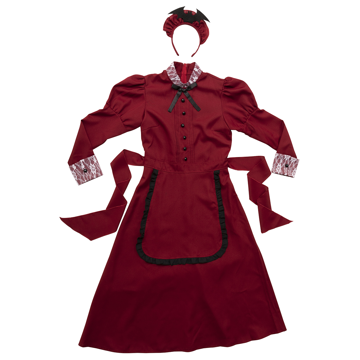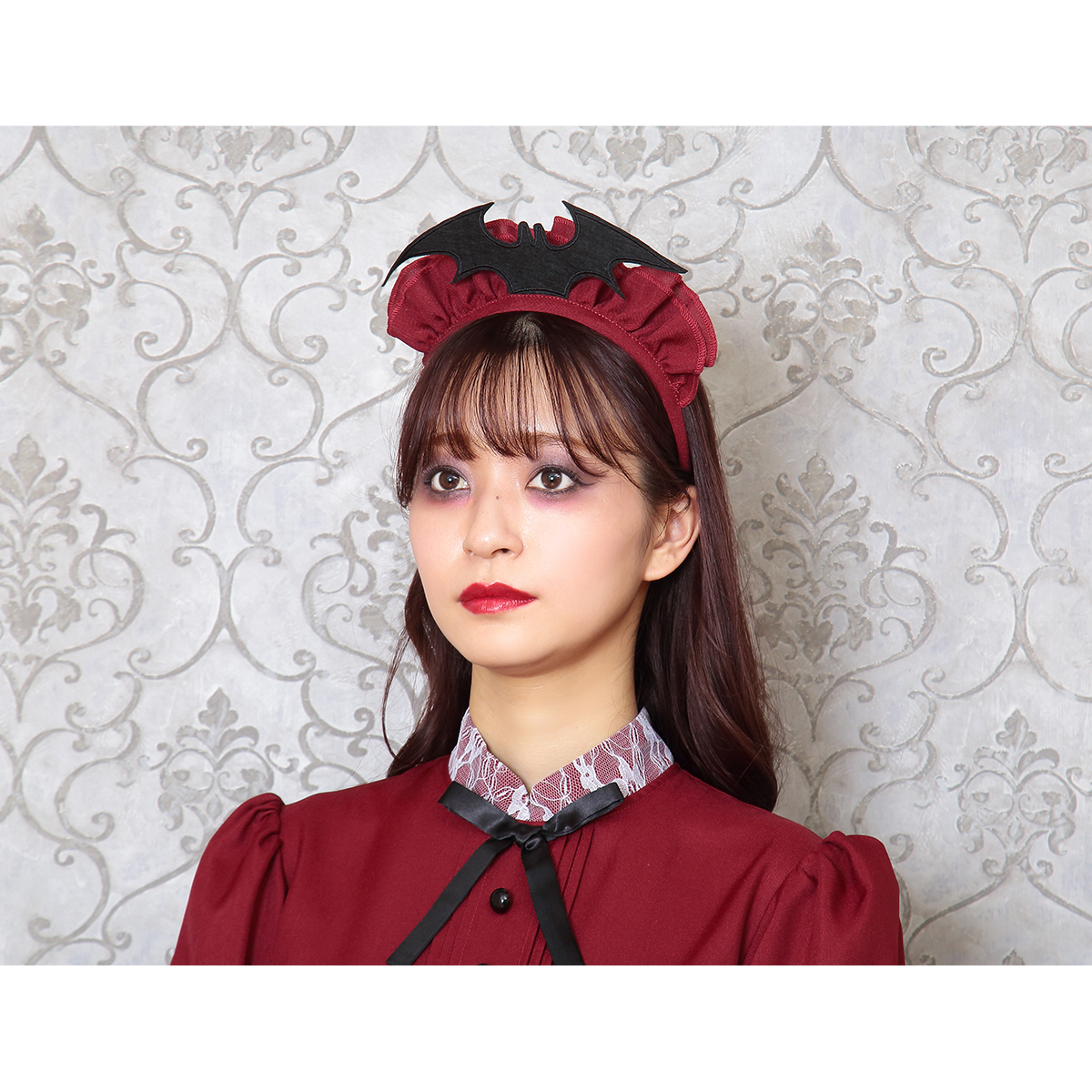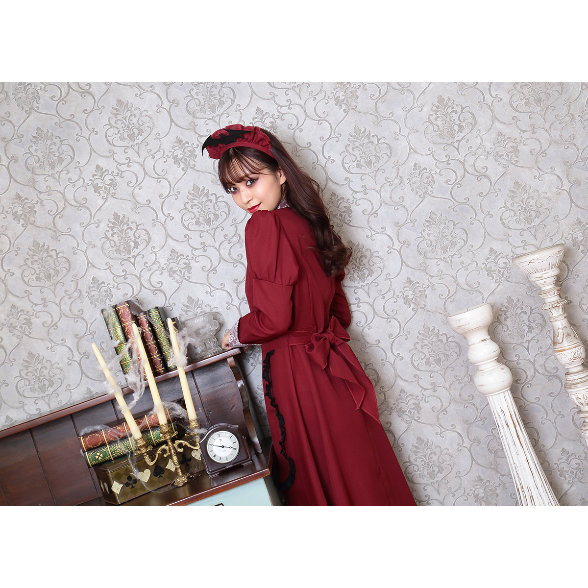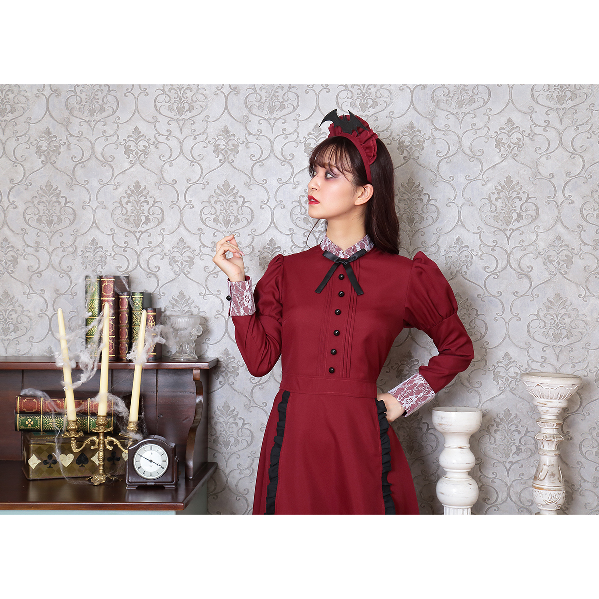 A famous western-style maid costume with deep red color. Bat attached on the headgear is part of costume’s charm. The long sleeves and long length also protect against cold! It is also recommended to wear it as a pair with the "Western-style maid series".