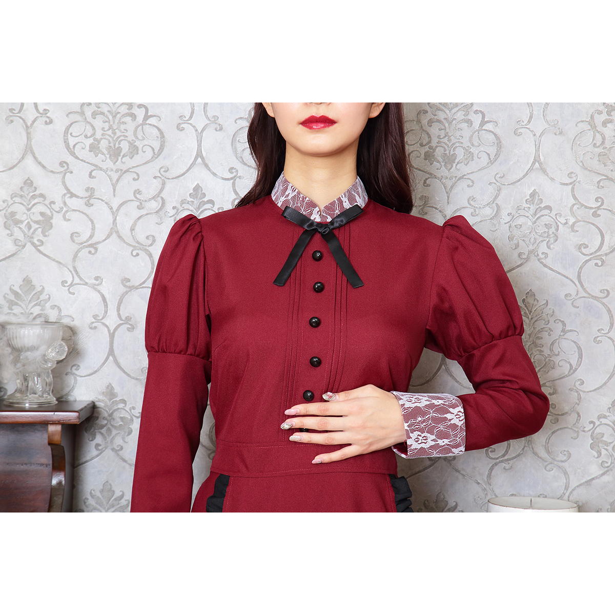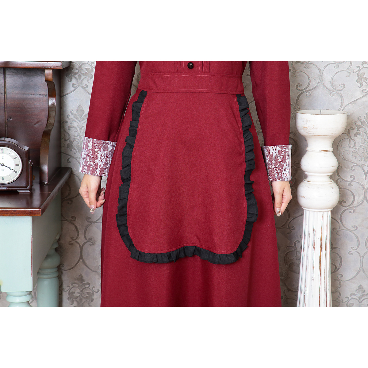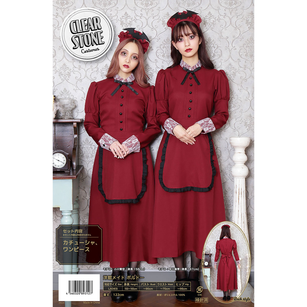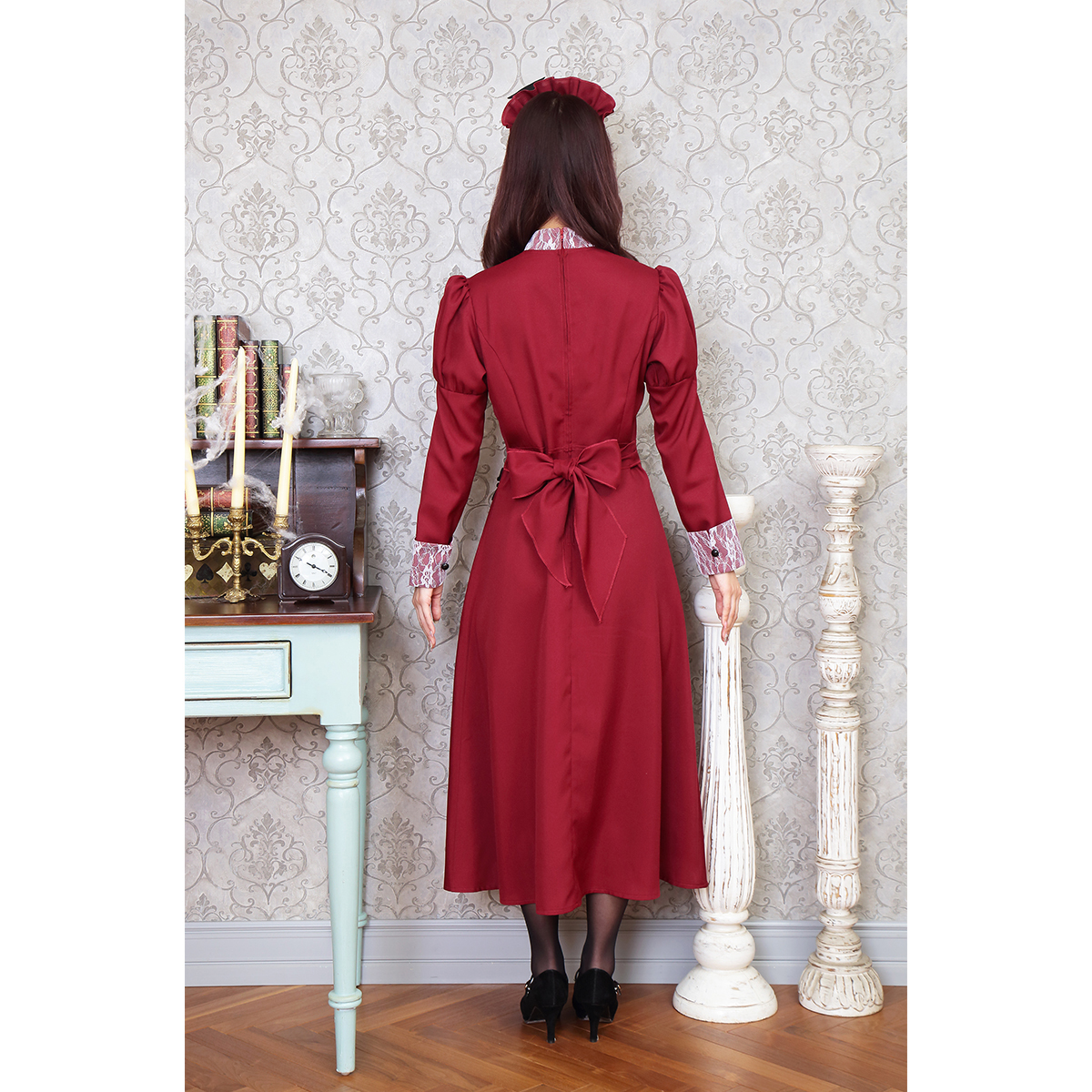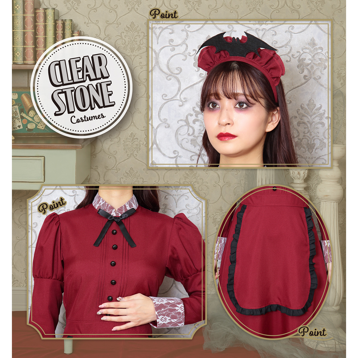 A famous western-style maid costume with deep red color. Bat attached on the headgear is part of costume’s charm. The long sleeves and long length also protect against cold! It is also recommended to wear it as a pair with the "Western-style maid series".