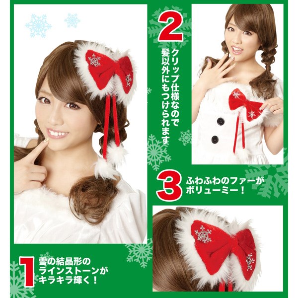 大蝴蝶结设计,充满蓬松的毛皮!雪的结晶形状水钻,闪耀动人!发夹样式,头发以外的部分也可配戴。可作为衣服的胸针配戴,或装饰于礼品袋也Good!